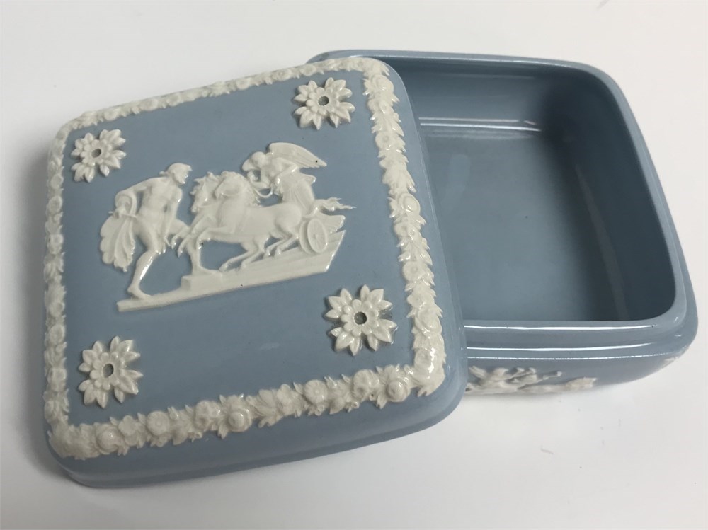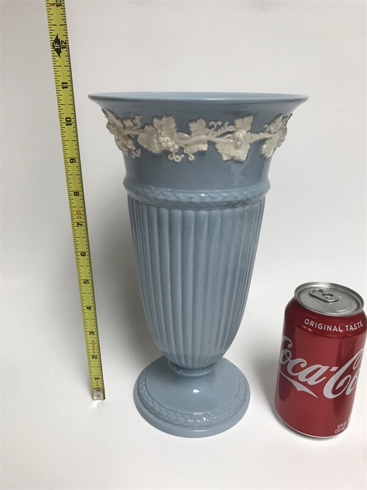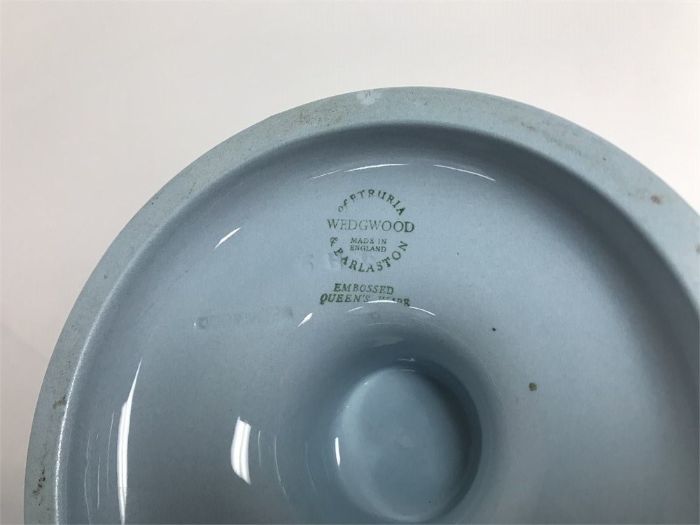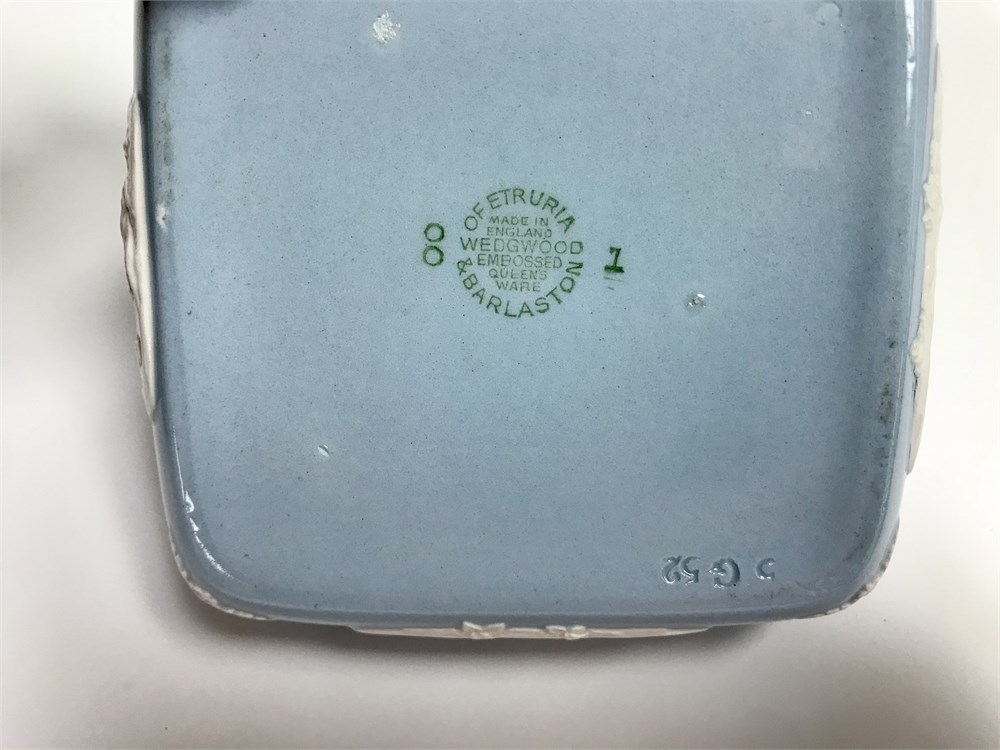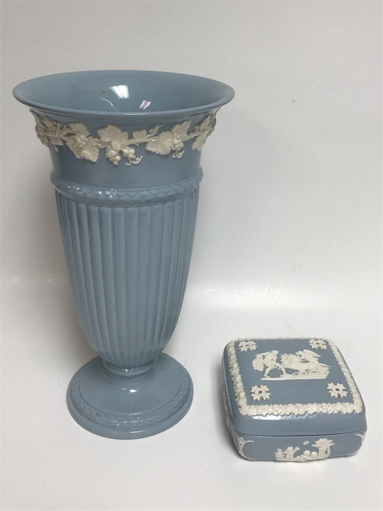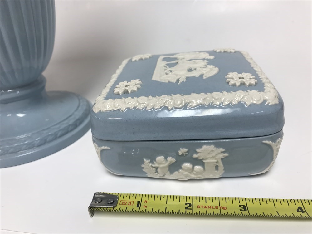 Both in good condition.  English porcelain flower vase, about 11" tall, and a small dresser box.  Both stamped with a Queensware Wedgwood mark as pictured.