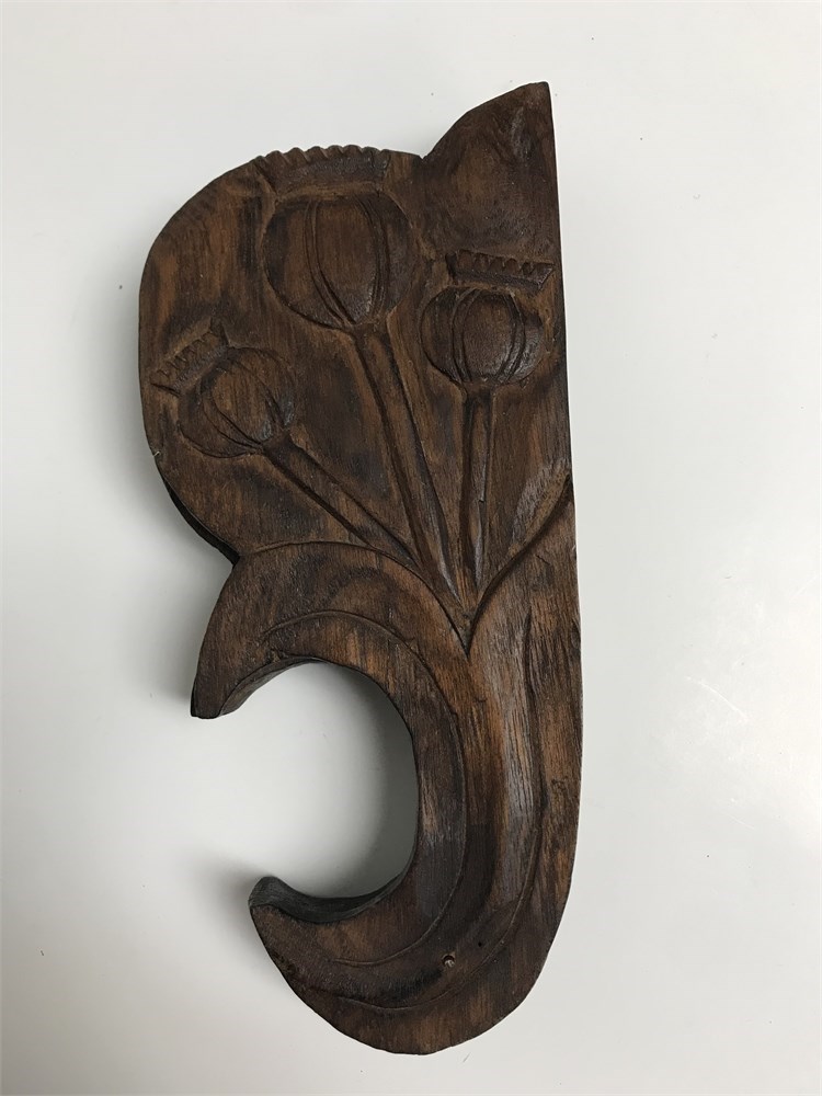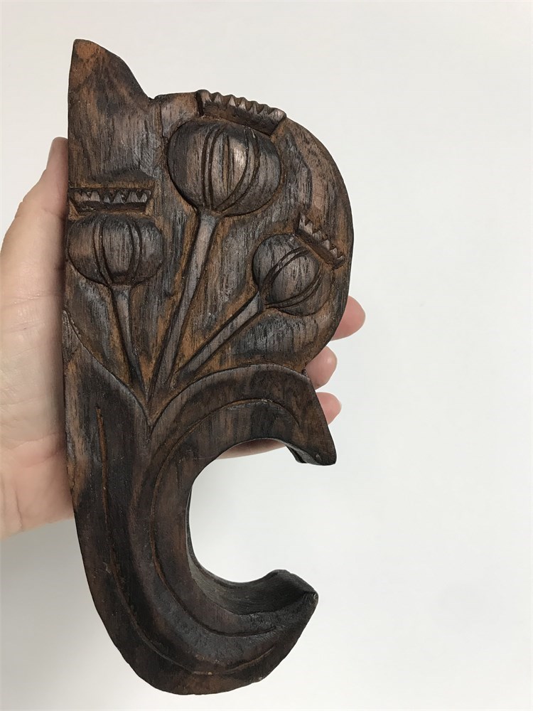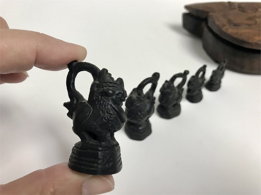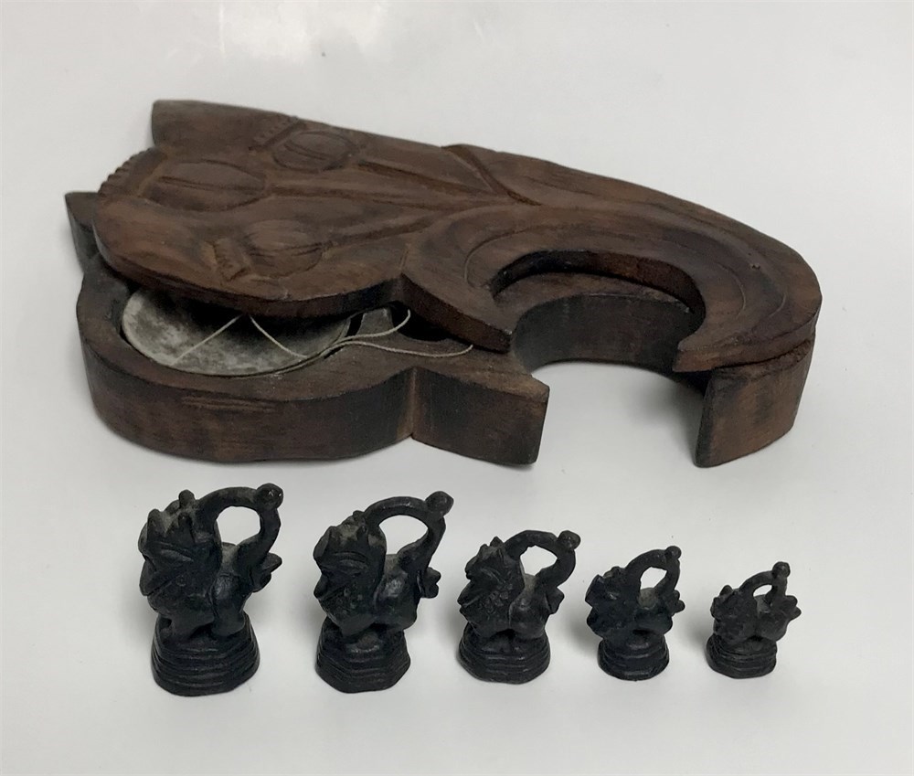 Wood box carved with poppies, swivels open to reveal a set of metal scales.  With 5 cast iron weights (apparently mythical beasts).