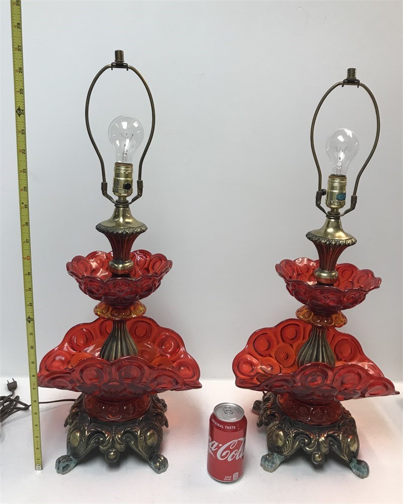 Gorgeous and rarely found moon-and-stars pattern lamps, red/amberina glass ("banana boat" shape) in metal mounts.  No chips/cracks in the glass; the lamps light up; the metal feet are oxidized; see photos.  Both for the bid!