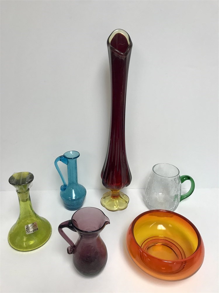 Mostly crackle glass and hand blown, good condition.  One piece has a Pilgrim Glass sticker.