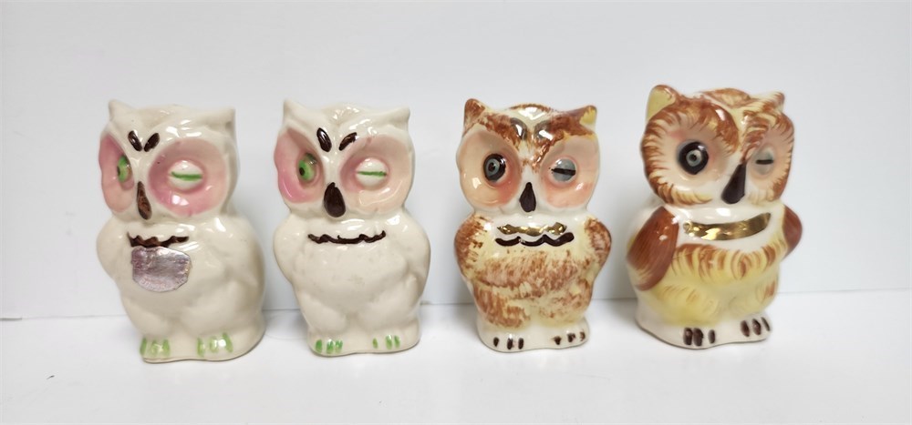 2 different sets of Shawnee "Winking Owl" Salt & Pepper Shakers, one of which set is gold trimmed.  Good condition, and one still has the original foil sticker too.  Approx. 3 1/4".
