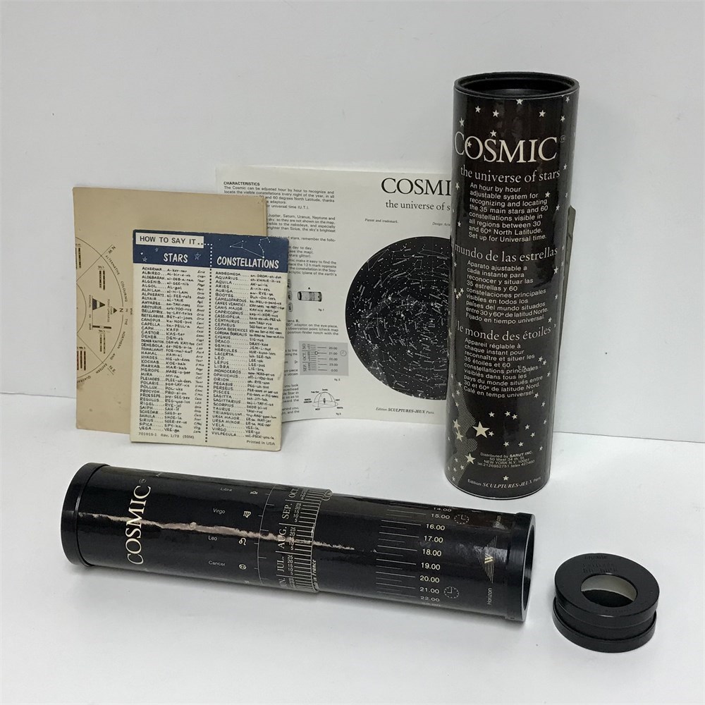Hour by hour adjustable system for recognizing and locating the 35 main stars and 60 constellations visible between 30-60 degrees north latitude.  (Also in the lot are a couple of pamphlets found in the estate, not necessarily related to the viewer, but freebies for you.)