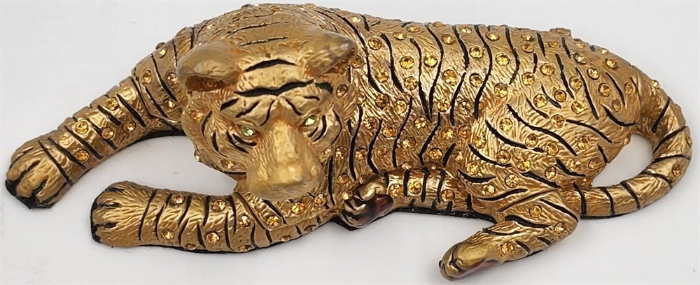 This is a heavy studded enameled metal tiger figure that has a storage compartment that seals magnetically. By the brand Perry Borrelli.