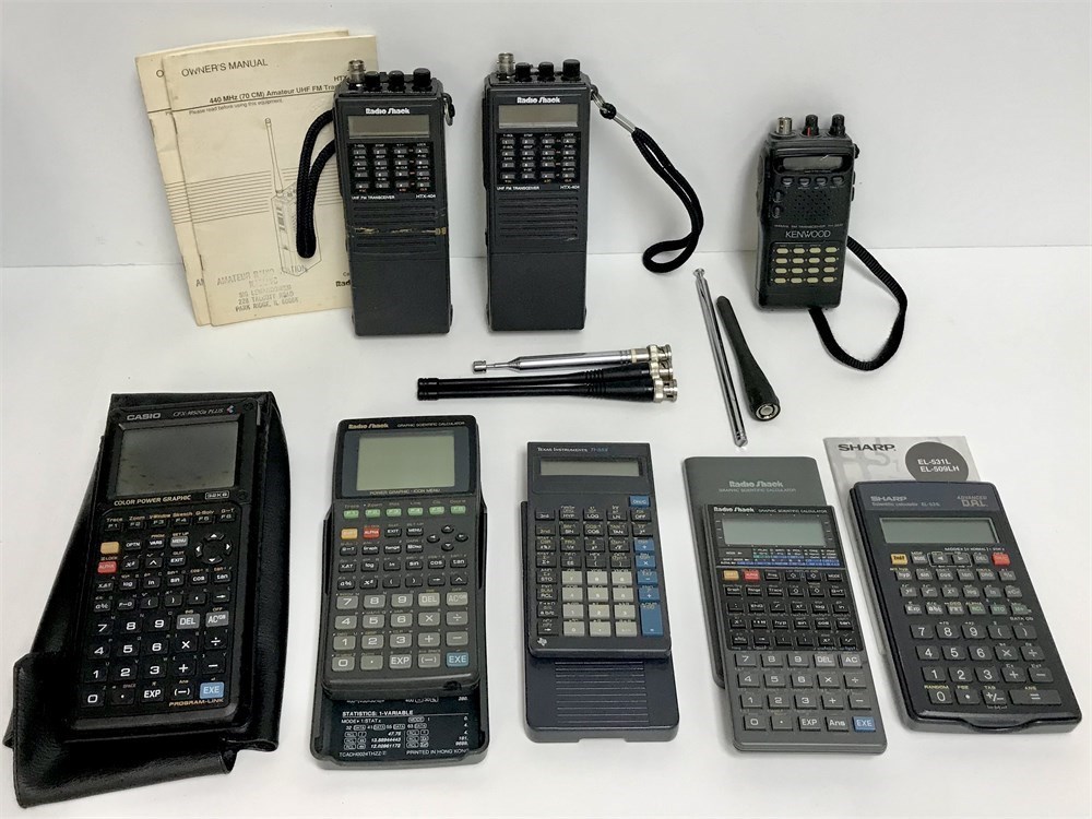 A pair of Radio Shack UHF FM transceivers, a Kenwood FM transceiver, 5 scientific calculators (Radio Shack, Casio, Sharp, Texas Instruments).