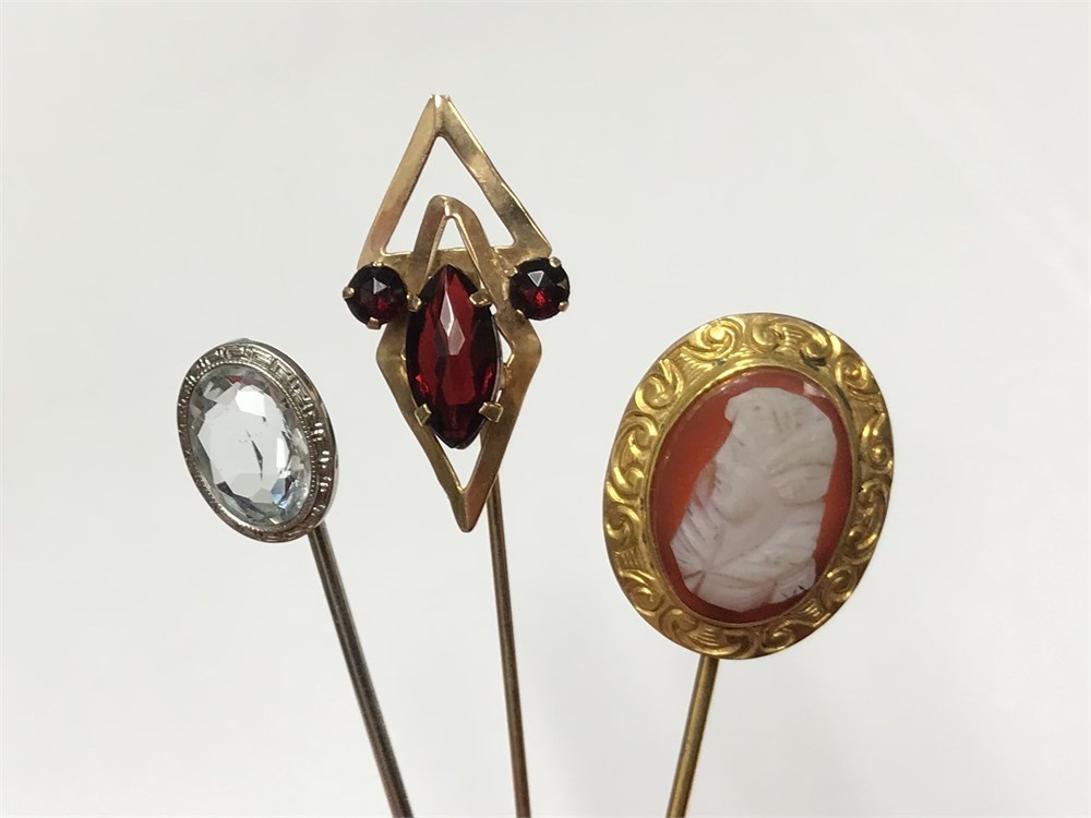 Antique red stone stick pin, unmarked, tested as 10K gold.  1.5 grams.