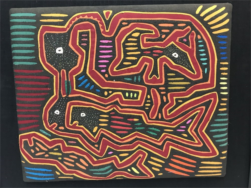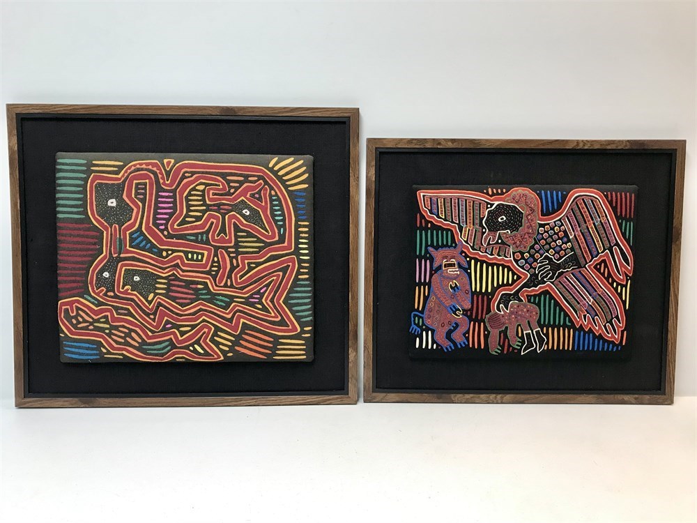2 framed Mola textiles (Kuna?), both vibrant and intriguing, professionally framed and in good condition.  Selling both together; bid your best.  These are from the lawyer's estate, which had fantastic items from around the world.
