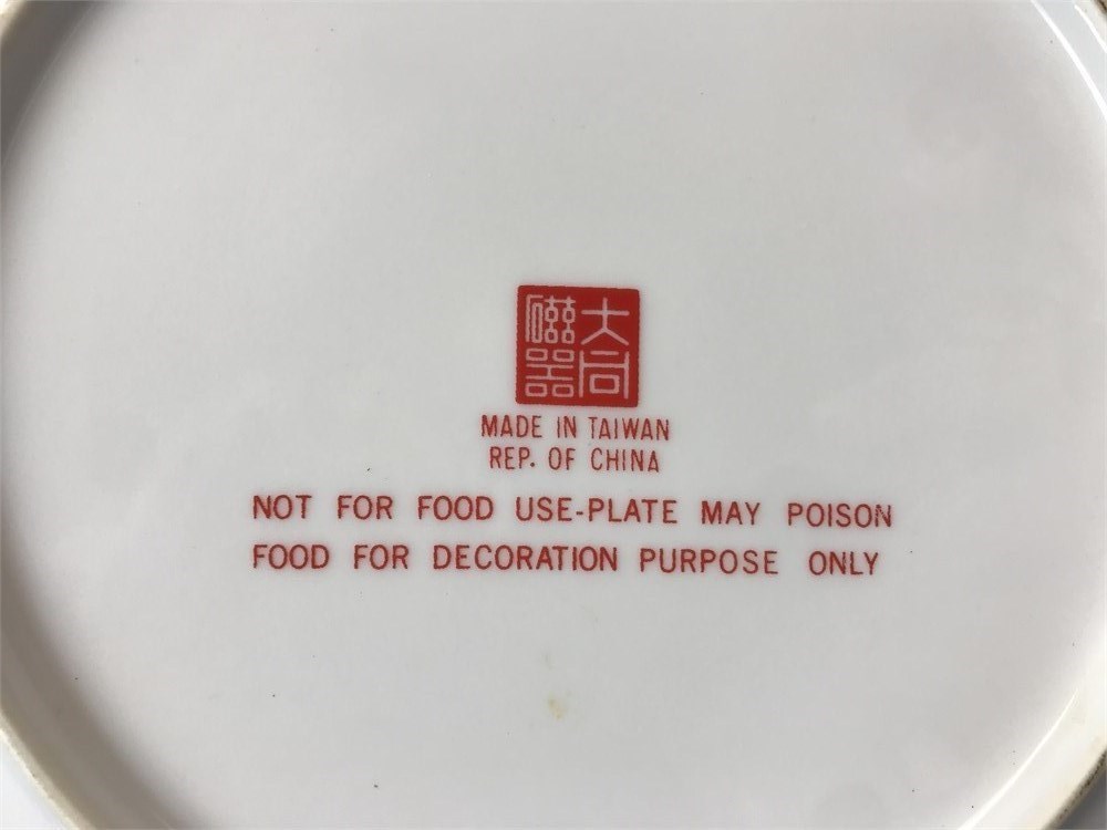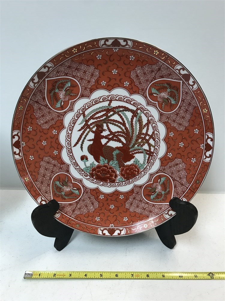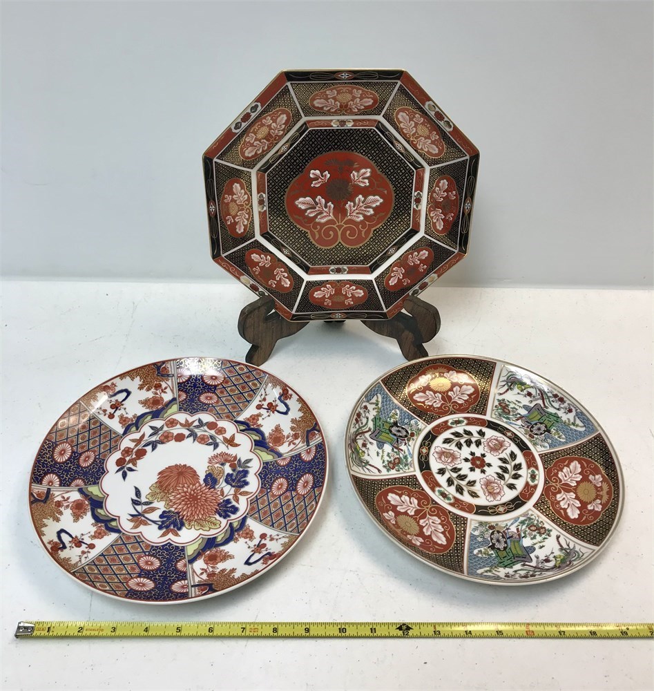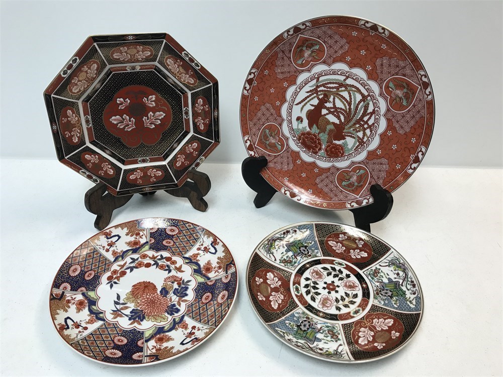 Lovely porcelain plates.  Marks including Japan and Taiwan (see pictures).  9" to 12" size.  All are in good condition, 2 stands included.