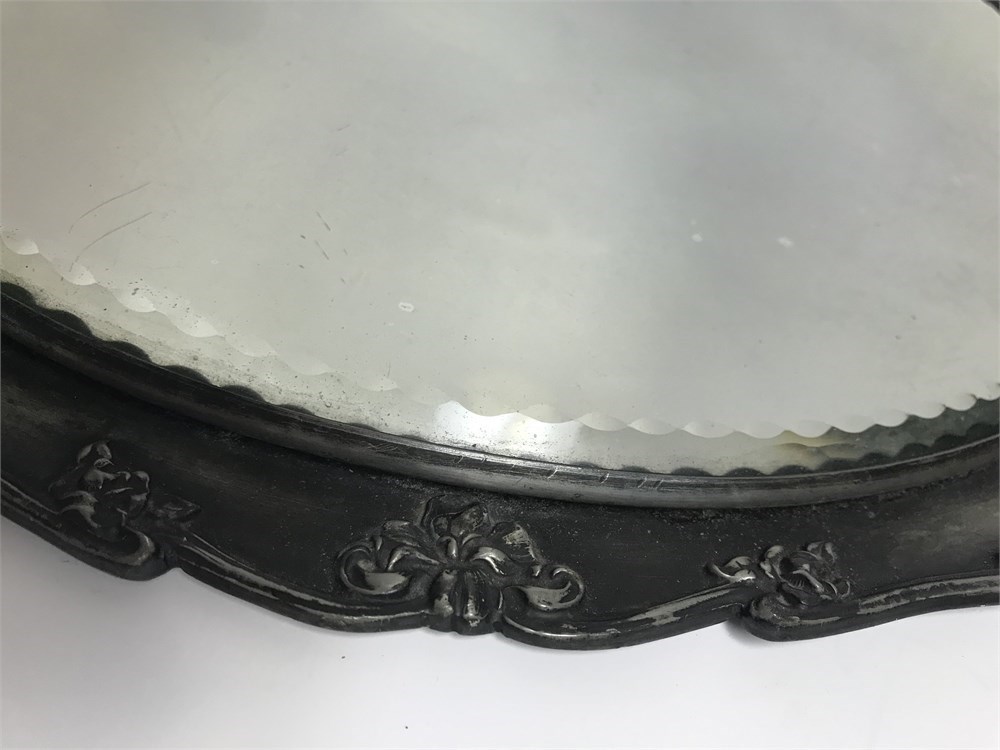 Elegant old plateau for perfume bottle display, or jewelry, etc.  A large round beveled mirror in a metal frame.  It appears to be silver plated, but no marks found.