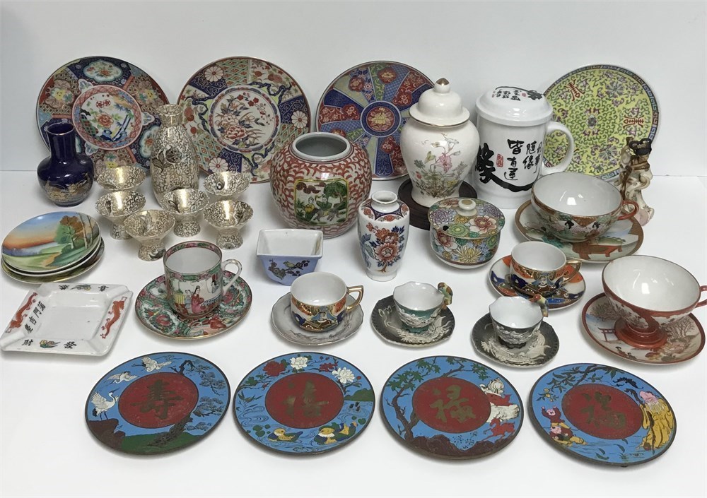 A variety of mostly Japanese and Chinese items.  Porcelain plates, cups and saucers (most are matched sets), dragon ware, Kutani jam jar (hairline crack), repro Kutani vase, sake set with 6 cups, small vases, more.  4 enameled brass plaques.  Mostly vintage, a few items are newer.  Interesting group.