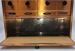 Vintage bread box with additional storage compartments for your tea, sugar, flour, and coffee.  Copper colored aluminum/metal.