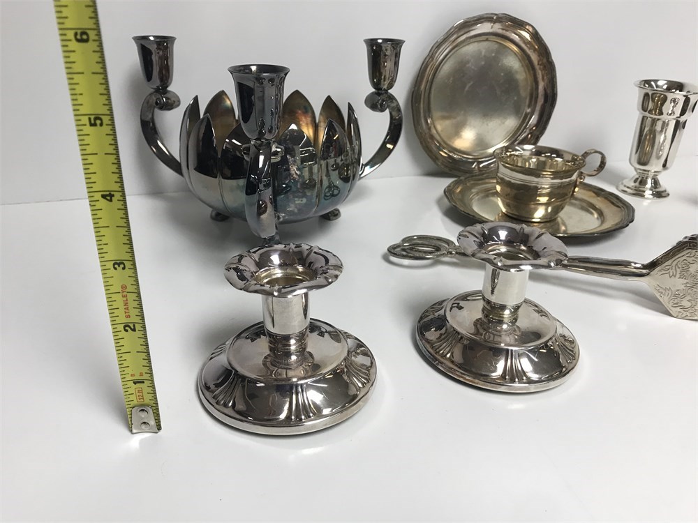 Silverplate and Metal Group: Candlesticks, Centerpiece, Tongs +