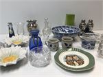 Group deal!  Italian daisy bowls, glass cruet, shakers, cute Norway plate, blue-and-white Pottery Barn bowl, other items.  The metal vase is Restoration Hardware, India.