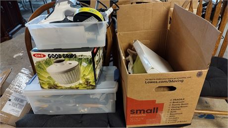From Clear Creek home this is a big lot of nice items from kitchen and utility room.  3 ceramic bake pans (all different colors and sizes), salad spinner (looks new), clean name brand iron, desk lamp, all kinds of items from kitchen drawer and more!