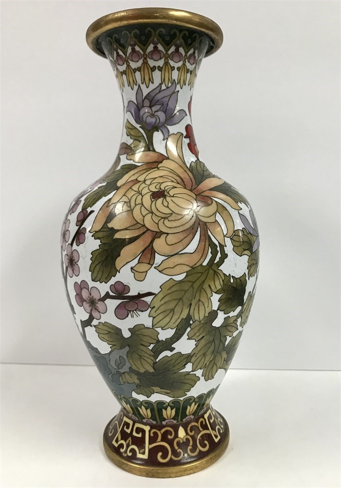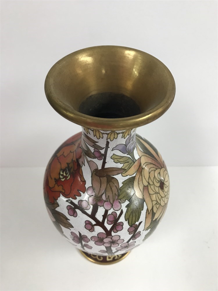 A pretty cloisonne vase with great colors.  Cherry blossoms, other florals, and a butterfly on a white background.  9.5" tall (there is no stand).  Jingfa label on the bottom.