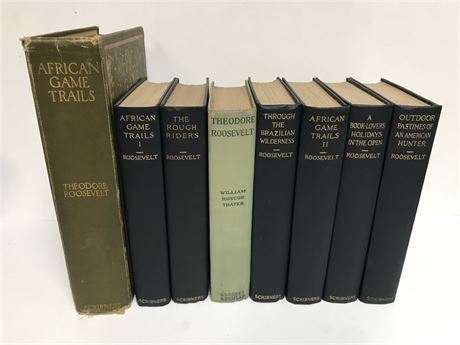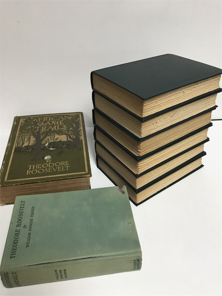 Books by Theodore Roosevelt, and 1 book about him by William Thayer.  The set includes African Game Trails Vol 1 & 2; plus 4 others.  Also a copy of a larger African Game Trails.