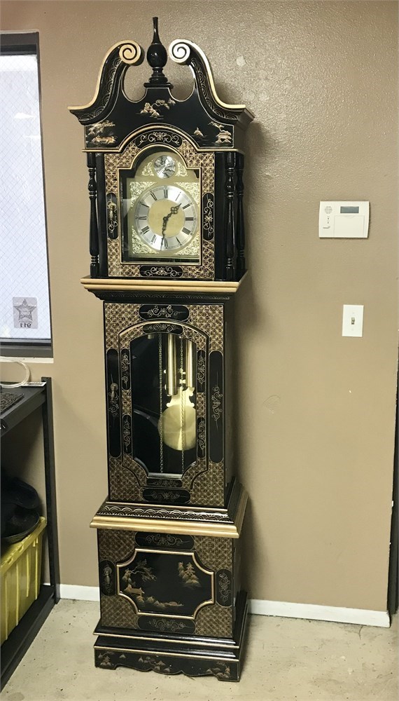 A gorgeous Tempus Fugit grandfather clock, in running condition with a pleasant chime.  The black case is handpainted with Asian style scenes and details, with many gold accents and trim.