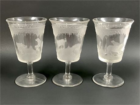 3 Early American Pressed Glass goblets, each with the Polar Bear design, which is 3 panels of Arctic animals - a single seal, a seal with pup, and a polar bear, all under frosty icicles.  These glasses are in good condition with no chips or cracks.  A very special find to a collector!
