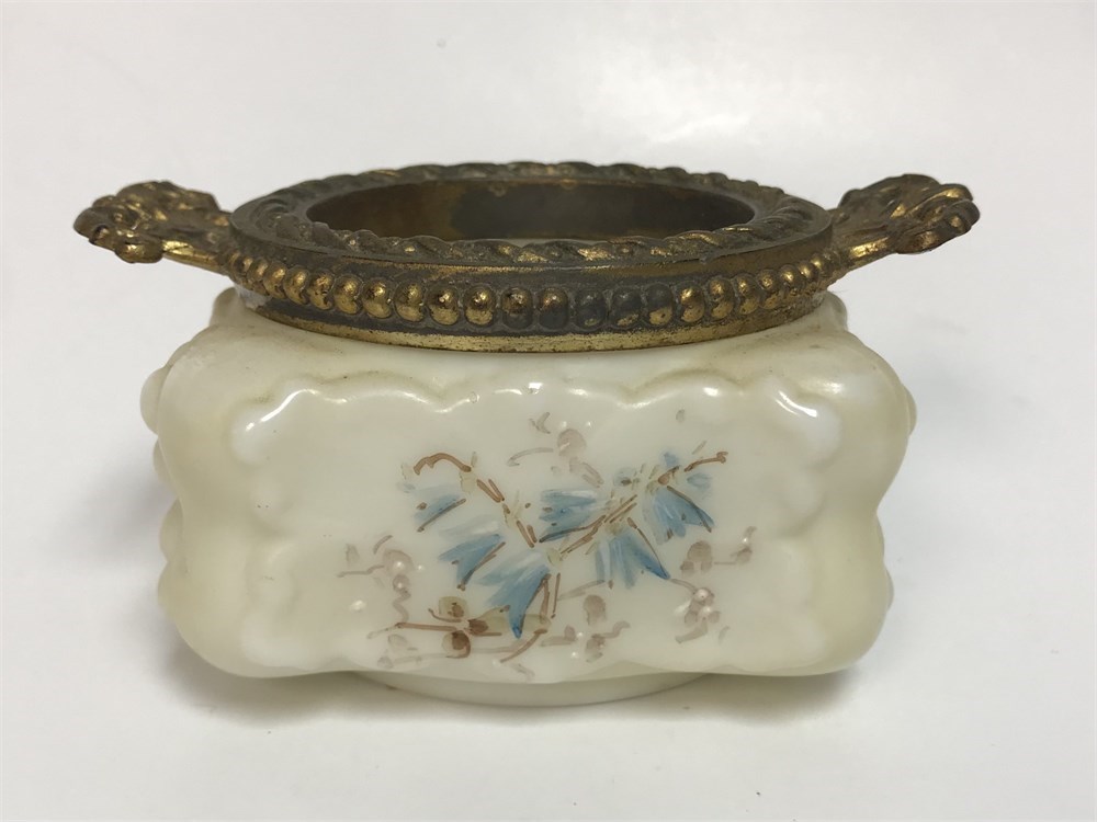 A small open antique vanity box for milady's use, to hold small pins.  Handpainted glass with fancy metal rim.  No chips or cracks.  Light red Wavecrest mark with C.F.M Co included at the bottom (C.F. Monroe Co.)  In my opinion this is a somewhat harder style to find versus the round ones, and it has the superior collar.