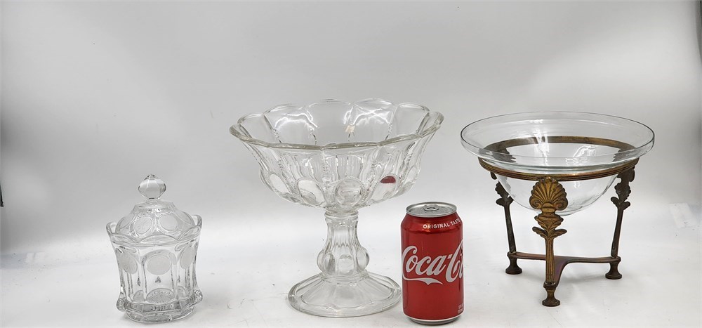 Fostoria Coin Glass Candy Dish, Vintage Compote, Glass Dish with Brass Stand