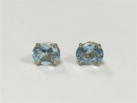 Oval blue topaz, approx. 1.5ct each, they're pretty.  Pierced earrings, 14K yellow gold (marked), one is missing the backer.
