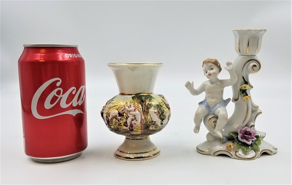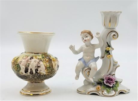 Two porcelain items featuring putti.  A vessel with dancing putti by R. Capodimonte, Italy; and a candlestick with putti by Unter Weiss Bach, East Germany.