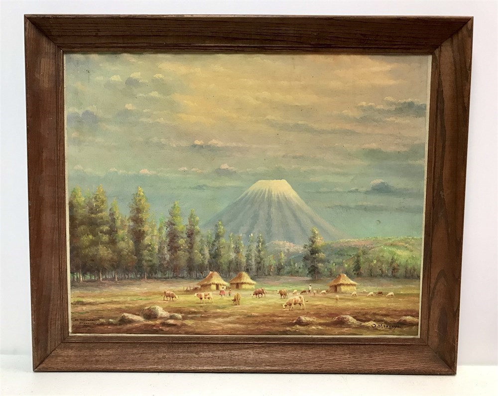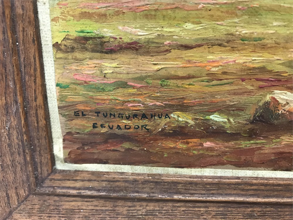 Original painting on board, signed O. Moncayo.  Titled in lower left: El Tungurahua, Ecuador.