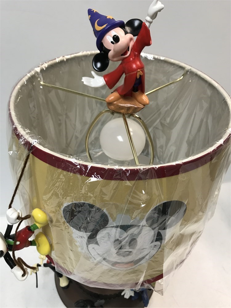Super cute Mickey Mouse lamp, showing him in various costumes "Through the Years."  In working condition with bulb, the scissors in the hands of one of the figures is broken, but it's a small detail compared to everything else going on with this piece.  A Mickey is even rappelling from the lampshade!.  A fun collectible, issued by Bradford Exchange.  About 21" tall.