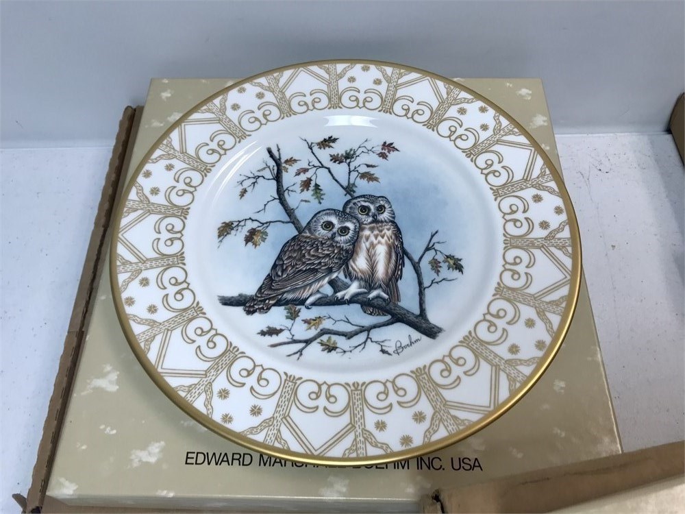 A nice series of large porcelain plates, each a different Boehm owl, set of 8 total (which is the complete set according to the letter as pictured).  Each has original box, outer shipping box, and also paperwork/certificates with it.