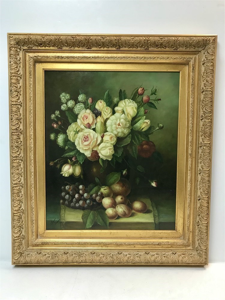 Gorgeous still life, flowers and fruit.  Signed Hawkins in lower left.  Good condition, in a good frame, and the certificate is on the back.  Retail price is indicated as $599.