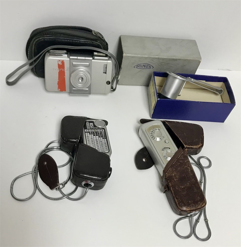 Small "spy" camera with case, Minolta-16.  Also 2 small meters, and a film viewer with box (Minox).