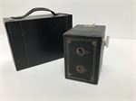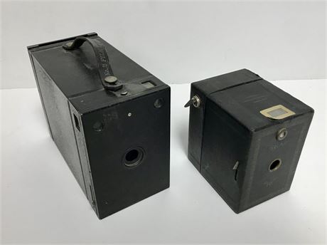 2 small antique box cameras.  One says No. 2 Film Back Hawk-Eye.  The other is Snap "16".