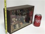 A shadowbox diorama covered by glass, full of miniatures.  General store scene with lots to look at.  8" tall.