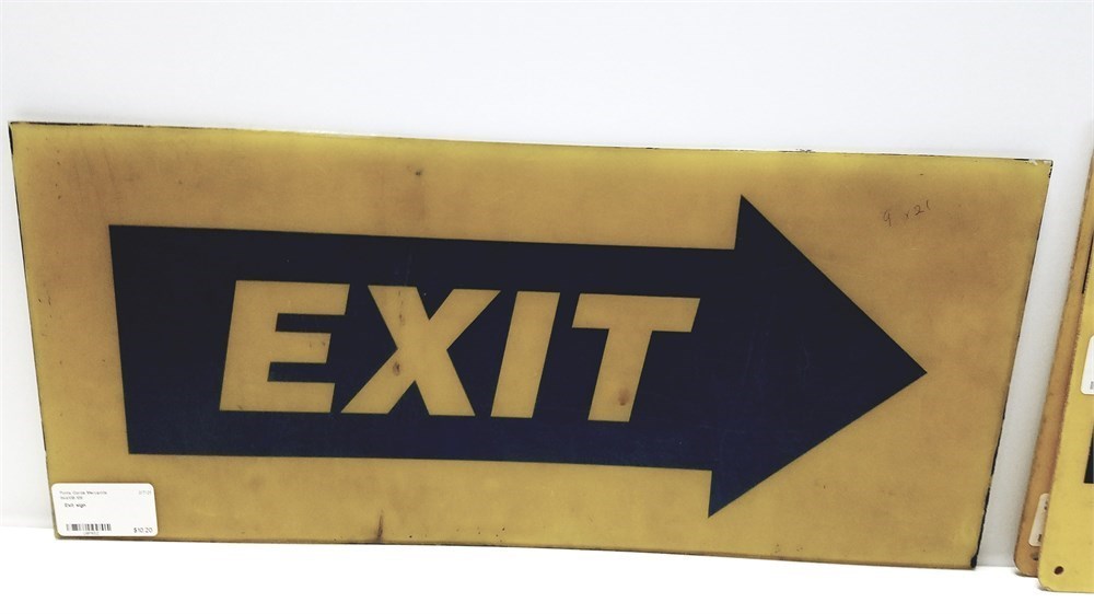 Five vintage plastic signs including: Danger (No Smoking, Matches, or Open Lights); 2 Caution (Hearing Protection Required), yellow Exit sign; Reserved (Disabled) Parking.