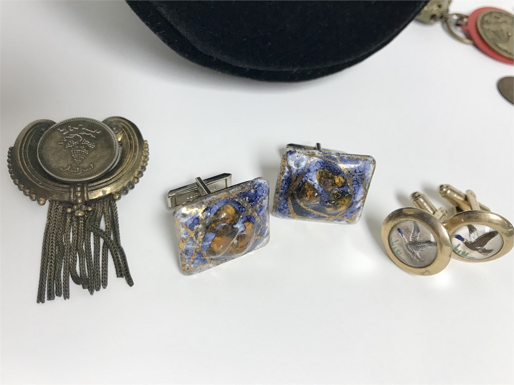 Costume jewelry including a very pretty vintage necklace (marked Sterling).  Also a brass bracelet, parts for an Asian style belt, 2 pairs of cufflinks, and an antique fringed pin.
