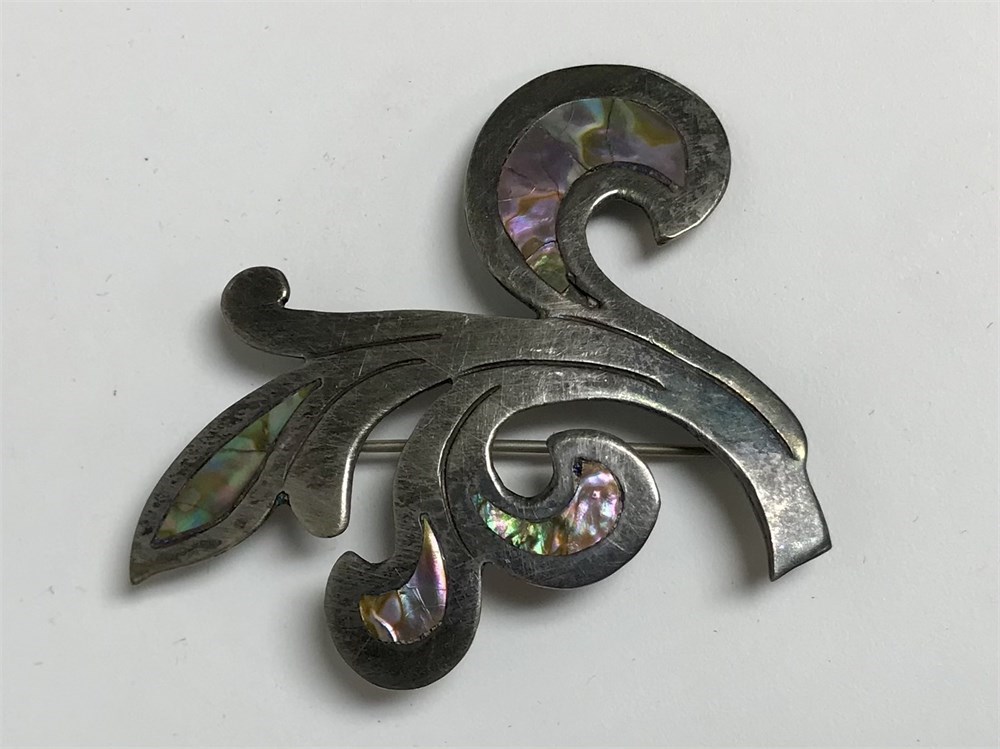 Group includes 3 small bangle bracelets, a little Mexico bell, a vintage dogwood scatter pin, a nice Taxco Mexico abalone brooch, small chime ball, and other items.  The ring's setting (ivory?) is unattached, and the hoop earrings are singles.  The larger oval pendant is unmarked.  Everything else is marked sterling and/or 925.