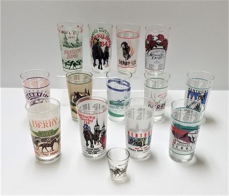 Group of twelve Kentucky Derby glasses; eleven tumblers (5 1/4 inches), one shot glass (2 inches). Tumblers from various years, earliest 1971.