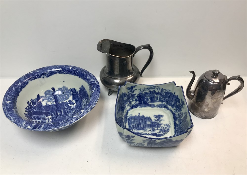 Large blue-and-white (flow blue) ironstone.  See photos for the designs and fancy Victoria Ware backstamps.  Metal pitcher (silverplate?) and a teapot or coffeepot which is marked Pewter.