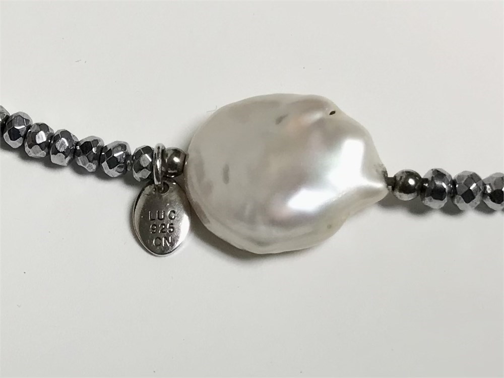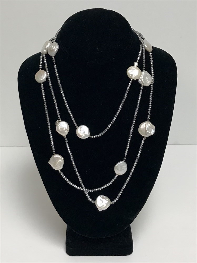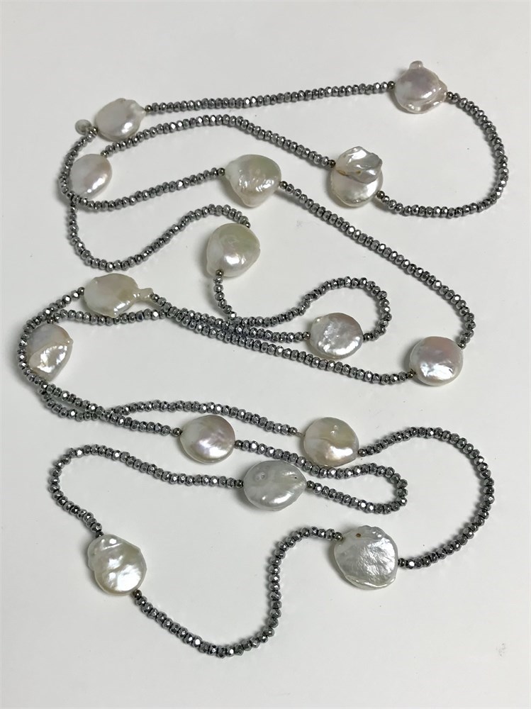 Designer necklace by Lucas Lameth, featuring large flat pearls and sterling silver beads.  Tag reads Luc, 925, CN.  It makes a statement and is quite long, 60".