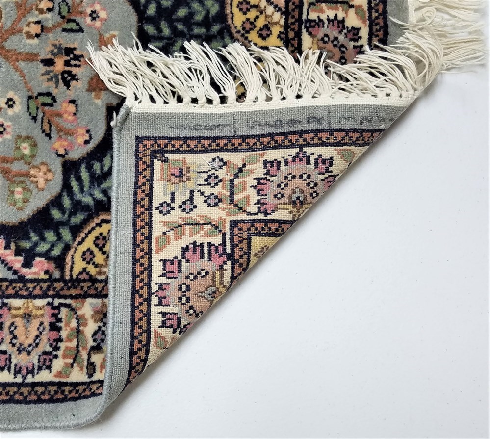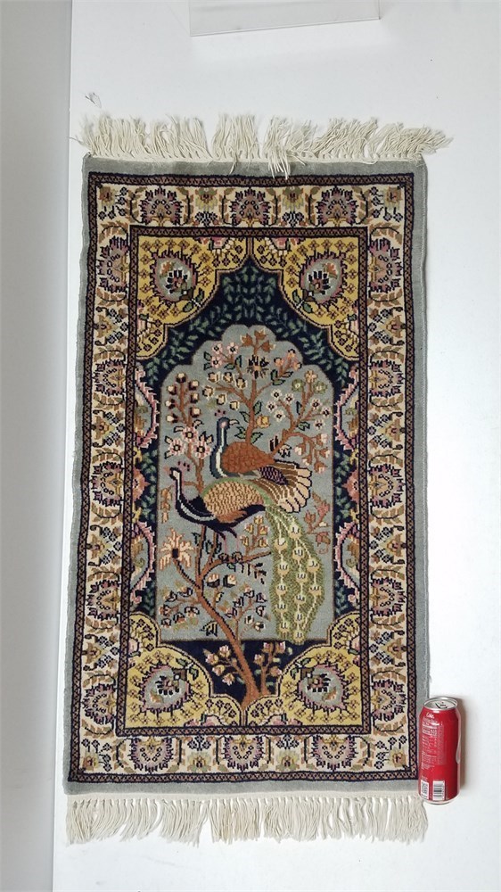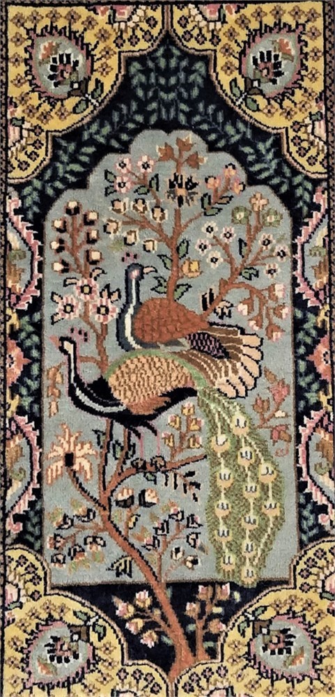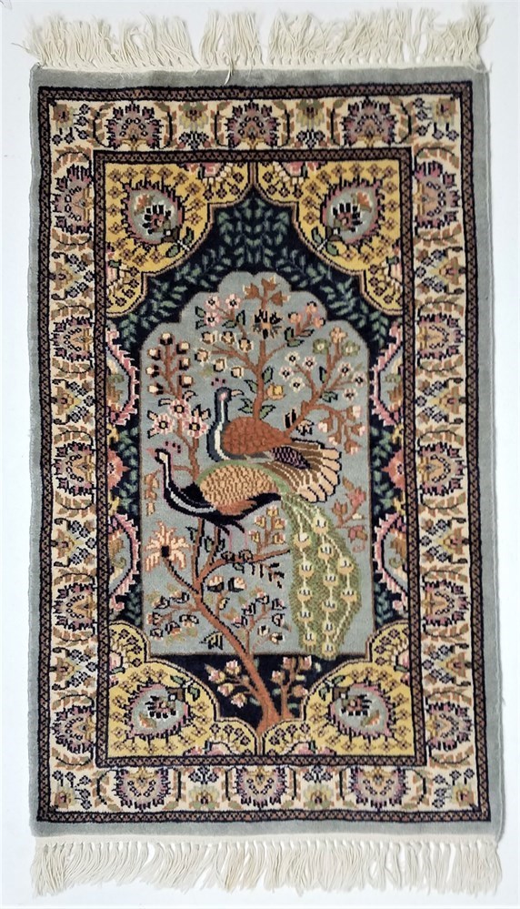 Accent rug depicting two peacocks standing on a branch within a window. 23 1/2 x 34 inches.