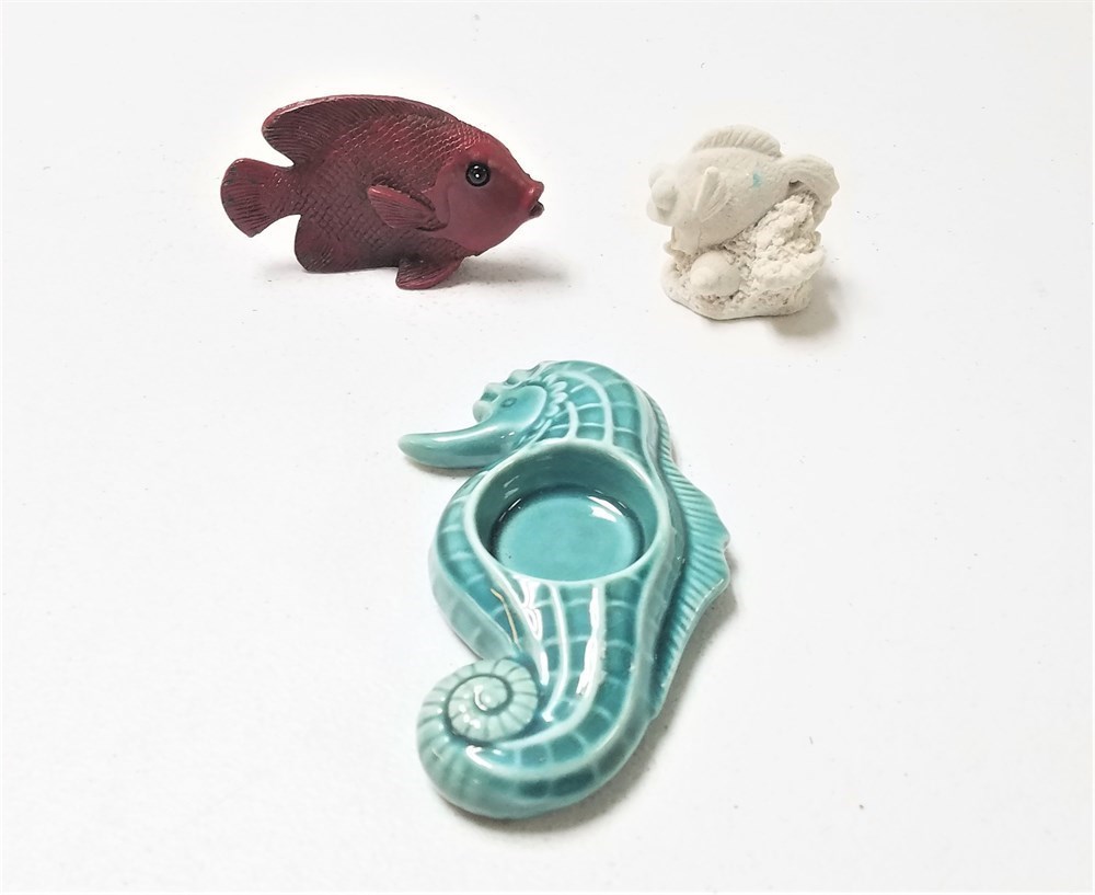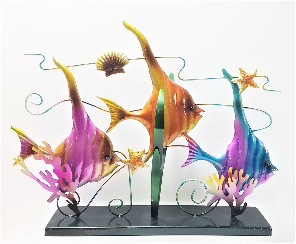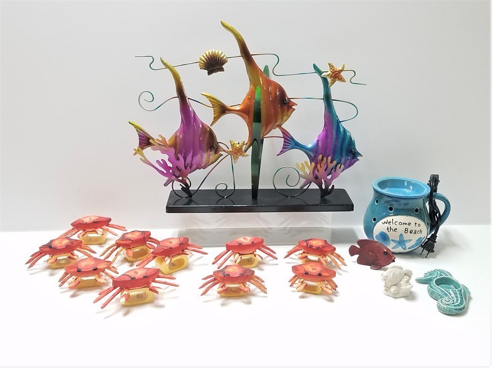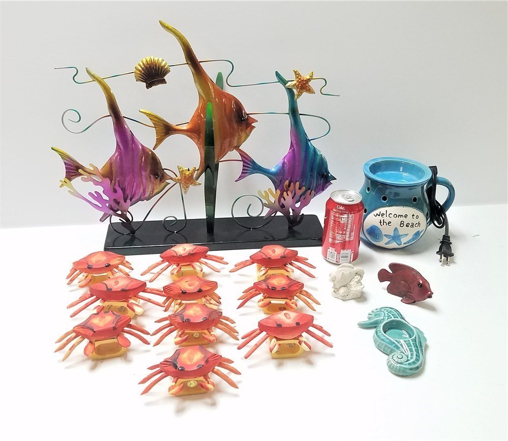 Lot of cute 'beach house' accent items.  A modern metal decorative sculpture of tropical fish, a ceramic "Welcome to the Beach" wax melter, set of 10 wooden crab napkin rings.  Plus 2 little fish and a seahorse tea light holder.  Cute group!  Sculpture 20 inches wide by 15 inches high.