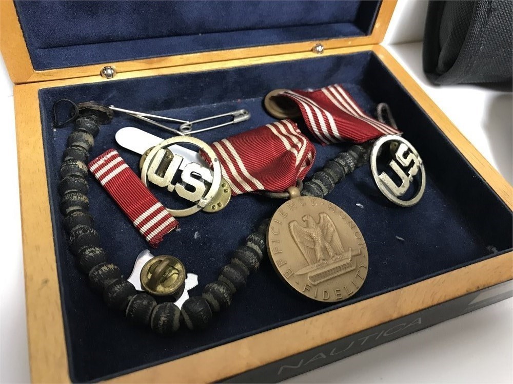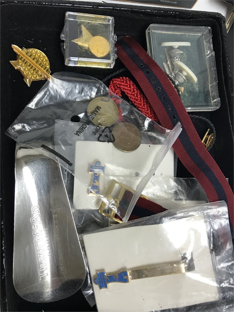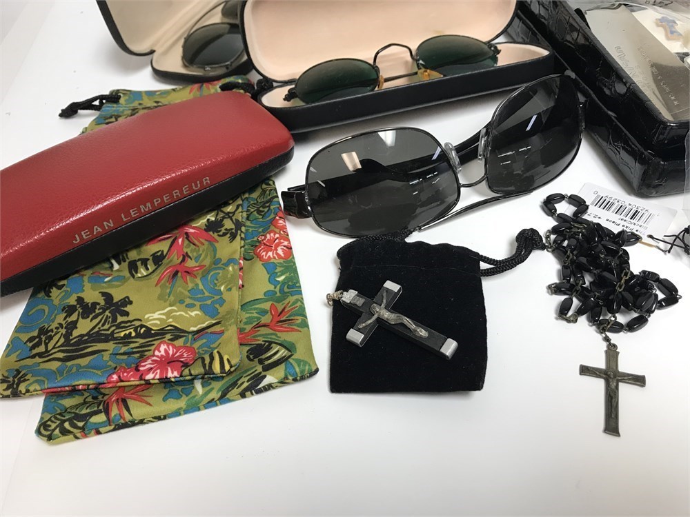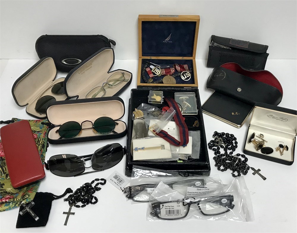 Honestly this are just items from a drawer; look through and see what you can find.  Small pins, tie bar, military medal and pins, rosaries, sunglasses, reading glasses, misc.  Some of the glasses cases are EMPTY, so unfortunately no Oakley sunglasses, or Maui Jims here.  (Although there is Oakley cleaner!)  Nautica box, other misc.