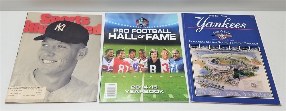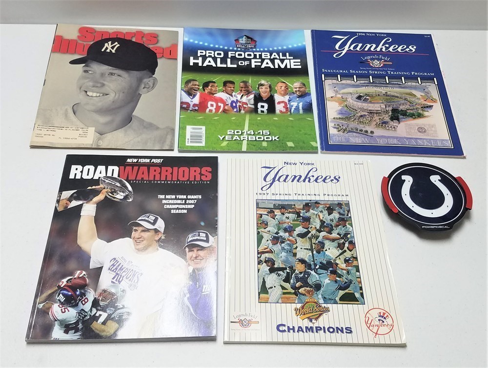 Four vintage sports magazines celebrating World Series wins of the Yankees and Giants, as well as recent NFL yearbook and Powerdecal for Indianapolis Colts.