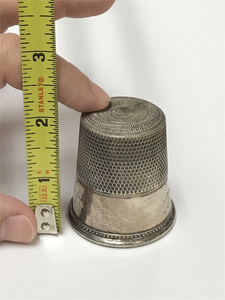 A shot glass shaped like a sewing thimble with the amusing motto "Only a Thimble Full".  It's 2" tall and weighs 36.7 grams.  Marked Sterling.