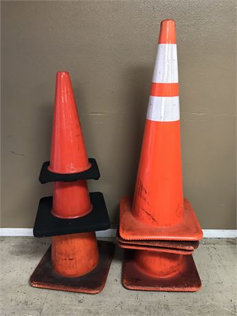 Seven traffic cones, 1.5 foot tall up to 3 ft tall.