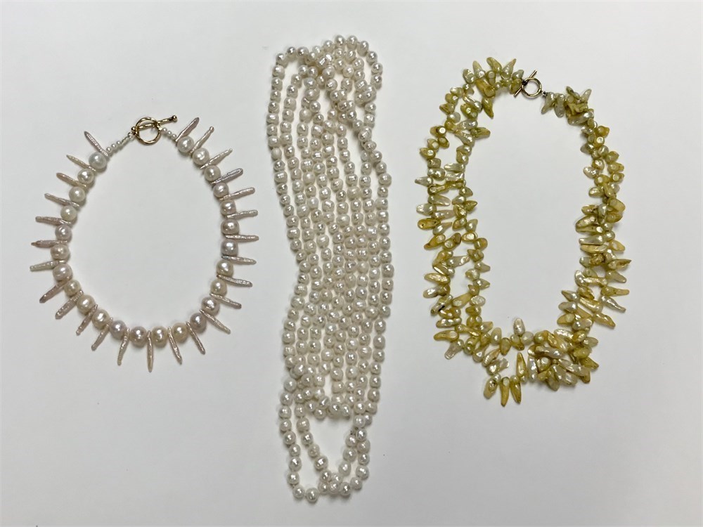3 real pearl necklaces.  The longest is an amazing 100" strand.  Another is a double-strand yellow blister pearl necklace.  The third is a shorter length with goldtone toggle.