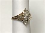 Sparkly diamond ring, with multiple stones in the center cluster as well as baguettes along the sides.  The diamonds test genuine and the ring is marked 14K; it's yellow gold.  Size 7.
