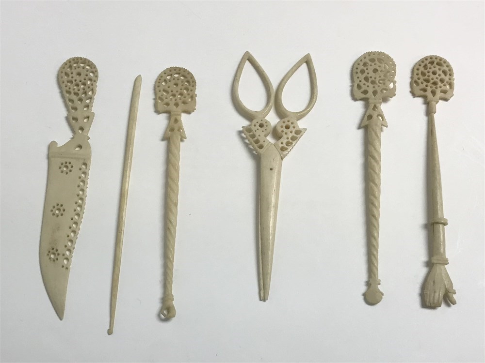 6 pieces including scissors, crochet hook, knife, more.  One piece is like a capped needle and the hands are made to grasp.  We assume these are sewing implements.  These appear to be bone rather than ivory.  Such a cool set!  Good condition, too, see photos for details.