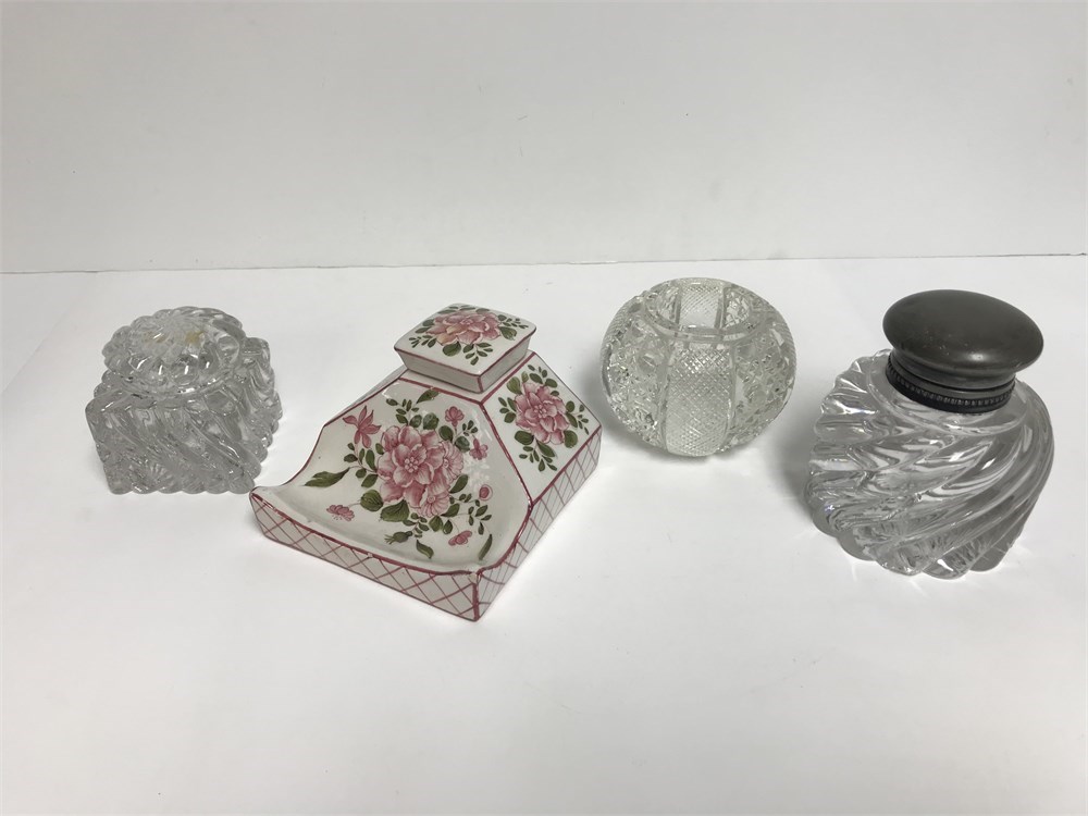 Porcelain Inkwell and 3 as-is Glass Inkwells