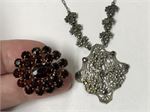 Antique style jewelry group.  2 very small stickpins, a Fishson rhinestone bar pin.  An unmarked filigree necklace, and a great sparkly garnet pin.