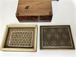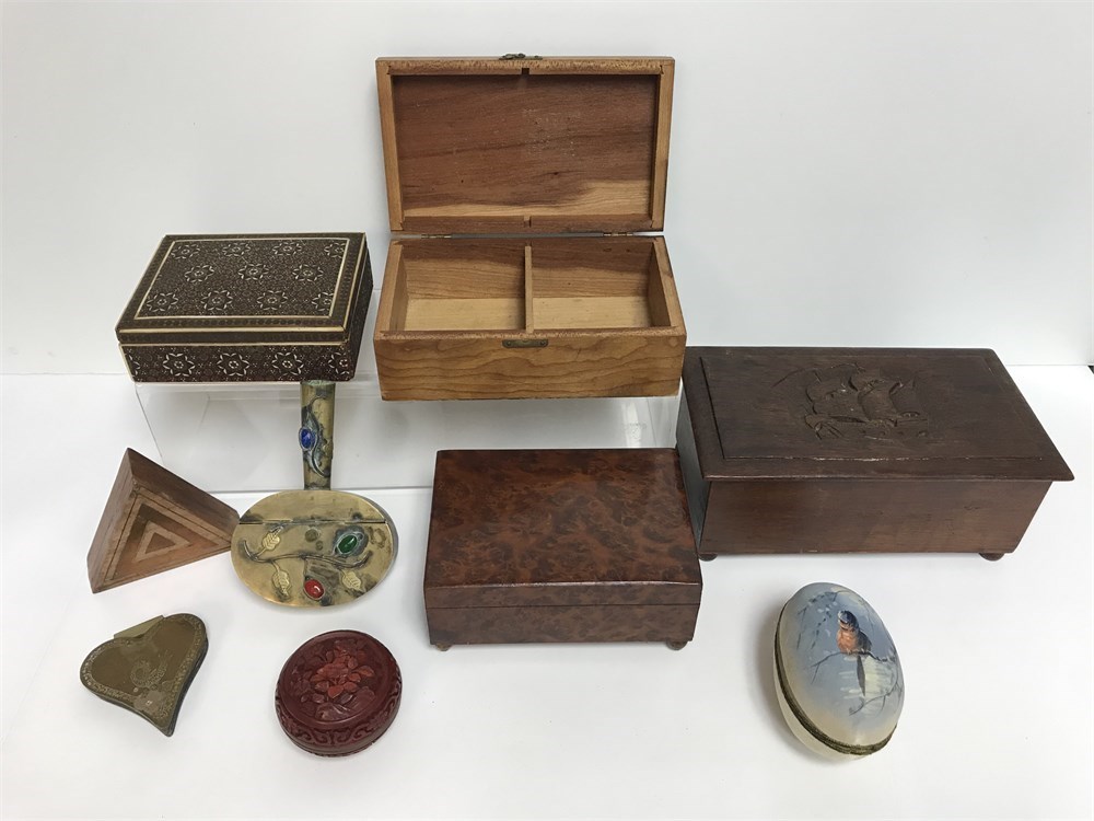 9 boxes including one with a carved ship on top, a musical burled wood (damaged on the side), and a little jewelry box.  Small brass "butler" and other small boxes including cinnabar.  Notice the delicate papier mache egg with a bird painted on silk, made in France.  The inlaid box is impressive with designs inside and out, but it does have damage and red discoloration on the bottom.